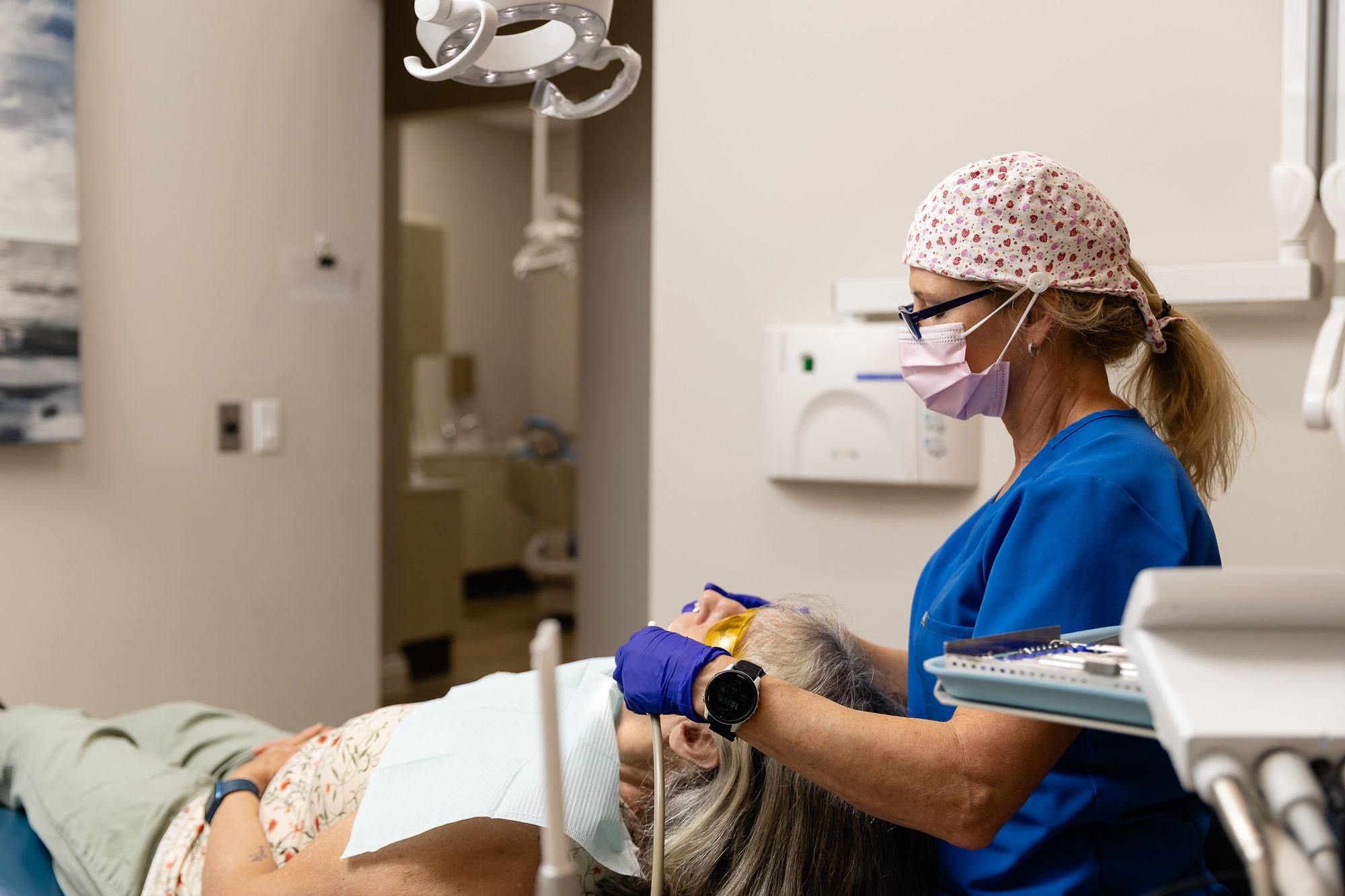 Three dental professionals attend to a person in a dental clinic, using various instruments. The setting is clean, organized, and well-equipped.